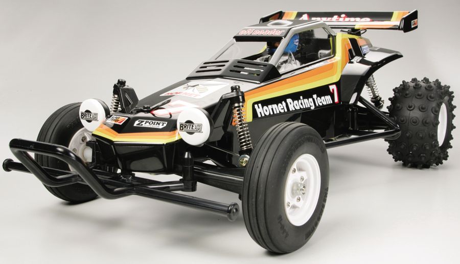 The revolutionary 1984 2WD off-road buggy is back and more fun than ever before! The Hornet stands as one of Tamiya's most popular R/C cars ever released, helping launch a 2WD R/C buggy boom worldwide. Featuring excellent performance on both dirt and on-road tracks, this awesome buggy can take on any type of terrain. Just like the original, this re-release features an easy to assemble chassis and drivetrain consisting of a durable but lightweight ABS resin bathtub frame, diff gear loaded sealed gearbox, oil filled rear dampers, powerful RS 540 motor and high performance suspension system. The Hornet is perfect for those that used to have one, those that have always wanted one, and for those that want a revolutionary buggy that has earned its place in R/C history.