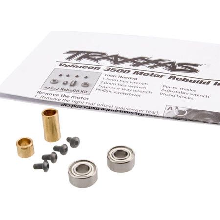 0-TRA3352 Traxxas 3352 Velineon 3500 Rebuild Kit <font color="cccccc" size="2" face="Arial, Helvetica, sans-serif">Includes</font><font color="00ff66" size="2" face="Arial, Helvetica, sans-serif"><br /> Two 5 x 11 x 5mm Bearings<br /> One 5 x 7 x 13mm Brass Bushing<br /> One 5 x 7 x 5.6mm Brass Bushing<br /> Four 2.5 x 5mm Button Head Screws (1.5mm hex size) </font>