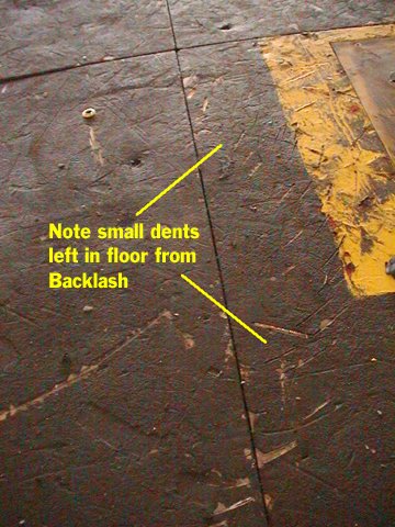 From eyewitness accounts, and the post-fight inspection of Backlash, it appears that what happened is that Backlash's side spike got pulled into the killsaw, turning the whole bot up on end and then flipping him upside-down. Backlash's disc was still spinning, however, and I was hopeful that it might provide enough momentum to kick Backash onto his wheels again (it happened before!), so Backlash spun around in circles, smashing dents into the BattleBox floor, but eventually came to rest upside-down.