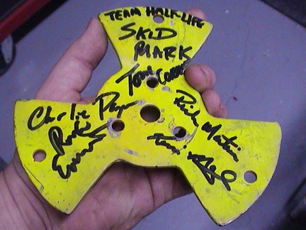Rob Everhart and Team Half life all signed one of the Backlash-scarred steel Tri-Foils from Skid Mark, and presented it to me as a trophy, thanks guys!