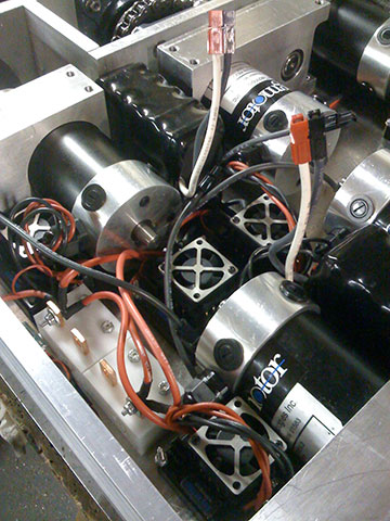 The first version of Breaker Box The original Breaker Box was a last-minute bot built specifically for the BattleBots - Cisco Party private event in June 2006. This event was a small, invite-only competition that took place in Las Vegas, NV to entertain Cisco employees at a corporate event. Eight robots were selected to compete, so it was a short, but awesome show! Breaker Box was built in the 3 weeks leading up to the event. Built from the ground-up, this 120 pound robot is a scaled-up version of my 1 pound robot, Shazbot. The main differences are that this robot is a 4-wheel drive instead of 2, and it is 120 times as heavy! That's a 50 pound, 3/8" thick, actuated titanium scoop with 1" thick titanium arms (special thanks to DCWaterjet and Team Whyachi for helping me get this awesome weapon cut and bent in such a short time). The main purpose of this weapon is to stop spinners and scoop them away. Based on the same concept of my success with the smaller Shazbot, this robot was made to take a beating from the best spinners out there- just run right into them! This plow is actually quite powerful, and can do a complete 360° rotation over the robot, thus enabling Breaker Box to flip over (and over, and over) if needed, and can also lift another robot off the ground. Given the right circumstances, this plow is able to lift an opponent over the inner wall of most arenas. The rest of the body of the robot is aluminum, mostly 3/8" plate construction, held together by about 150 machine screws. Power is NiCad battery packs. Each side on the outsides of the wheels is a custom geared pod for the lifting mechanism. There are two motors on the lifter, one on each side, so if one goes out, the other is still able to provide enough lifting power to the plow. |