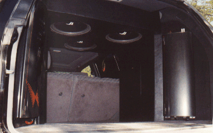 I had the box raised into position (using a car jack nonetheless!) The side supports doubled as component enclosures and the two monstrous amps flanked the outer perimiter of the install like two guards at attention! This unique setup only cost me a small amount of my rear cargo area, just the sides (that were already taken up by the wheel wells), and a bit lower of a ceiling. With the rear seats folded down, I still have a ton of hauling space! |