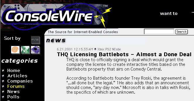 The following annoucement was made on the Console Wire site on 6.21.01 regarding the possibility of an upcoming BattleBots video game: