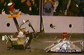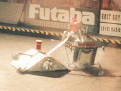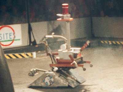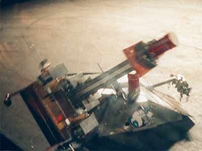 Later that afternoon, I was asked/challenged by one of the autonomous robot creators- "Thumper" if I would like to do battle against him (he had alredy beaten the tar out of the only other autonomous robots). By then, I was feeling a little more confident with my makeshift control system (we even got the mixing feature working again on my Radio transmitter, so steering wasn't nearly so hard as before), so I said sure! In case you are wondering about that "autonomous" thing, it is a robot that is completely self-guided and controlled. It has no human controller, it just is programmed to search down the robot with the other sensor and disable it. So, I had to attach a big red sensor to the top of Hercules for this event so that Thumper could "see" Hercules. I had a great time with this round, it was mostly for show anyway, so I let Thumper chase me around for a couple minutes until we both got stuck in a corner (requiring the arene crew to separate us), Then Hercules picked Thumper up and carried him to the other side of the arena, flipping him over first one way, then the other, and then a quick victory dance.... The crowd loved it, and it was pretty fun. The round was filmed by the 'Discovery Channel' and the 'Extra' TV show. |