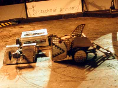 Next up was the Heavyweight Melee. (The melee is where they take a handfull of the surviving robots and put them in the arena together to narrow down the survivors). Hercules was put into the arena with 3 other Heavyweights- Kill-o-amp, Land Shark and Prometheus. The battle was pretty good for a while, and I got slammed so hard by Kill-O-Amp that my flipper-arm got bent into a "J" shape, rendering it almost useless. I did manage to slash the tires of Kill-o-amp, disabling him, then went after Land Shark, because Prometheus seemed to be dead as well. I tried several times to grab hold of something to flip him over with, but the bent flipper was too worthless. I wish I could have done it over again, I would have charged Land Shark instead of concentrating on trying to flip him over. The round dragged on, and at the end, there were two of us still able to move, so that meant we advanced to the Melee Finals! |