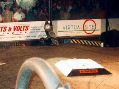 First to hit me was Do-All, who pushed me into one of the flipper-traps on the side wall, which held me there for a while before I was able to get away, and I started trying to cut into one of the other robots with my metal-cutting saw blades. I stayed out there for a while, afflicting the occasionnal cut or gash into someone, and Do-All was the first one out. I'm not exactly sure what happened to him, but he just stopped moving. LaMachine and Biohazard were pretty intent on each other, and I kept on both of them, trying to get a couple cuts in here and there and getting between their blood bath. A minute later, Biohazard got a good flip on LaMachine, and overturned him completely. That left just Hercules and Biohazard! I didn't have much I could do against Biohazard, because he was just too low to the ground for me to scoop underneath, so I mostly just got pushed around, and then he flipped me completely over in one of the corners. The crowd cheered, and everyone assumed it was over, but Hercules' flipper arm is dual purpose, so in a few seonds, I was able to flip back over and get back into the battle. The crowd went crazy! Biohazard tried again, flipping Hercules over on the other side of the arena, but once again, I was able to flip back onto my wheels! The cheers from the crowd told me they loved it! Biohazard (probably pretty annoyed at this point) turned around once more and got Hercules on the other side of the arena, and then flipped me into a precarious position near the wall, and it was over. For a second, I thought I could get out, but I was in such a position that I just couldn't quite reach the wall with the flipper arm. I lost the melee, but man, it looked great. This last event made the whole thing worthwhile, seeing my first time entry go head to head with the big boys made me realize that I COULD do this! |