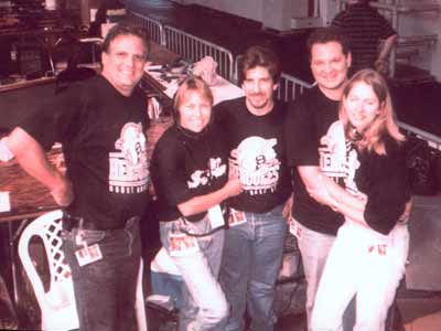 From Left To Right: Ken Corvino-helped with most of the lifting, transportation and troubleshooting at the event, Barbara (she wasn't actually part of my team, but was part of the Robot Wars staff, and happened to be Joe's fiance- now wife), Joe Lovullo-Helped out with the encouragement and setup at the event, Me- Jim Smentowski-Designer, builder and controller of Hercules, a.k.a. the guy who spent all his money on a crazy idea, and my wife-Erica, who, besides all the encouragement, helped tremendously along the whole way, and let me use the living room for my robot during the many months leading to the event! Not pictured is Lydia Greenfield, (who was taking this picture)- she helped out a lot with match info and organizing stuff for me during the event. |
