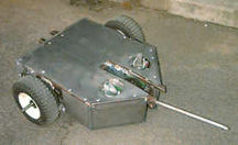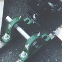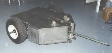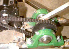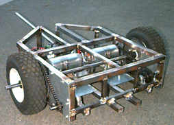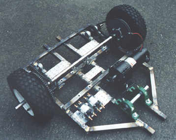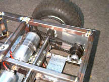 | The motors work through a two-step chain geardown system, the motors drive a 11-1 geardown ratio to the wheels. The rear shaft you see here holds two sprockets of different sizes to finally drive the 60 tooth sproket for the wheels. Each wheel is mounted to a single stationary shaft which is mounted to the frame. Each wheel has its own bearing system so resistance is minimal. The speed that these wheels can turn is amazing- Hercules can go about 25mph! | ![]() |