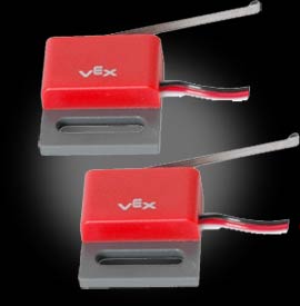Get even more creative with your robots by limiting action in programmed behavior. Kit includes a pair of simple limit switch sensors custom built for the VEX Robotics Design System. Switches send a signal to the Microcontroller when that are triggered. These switches are great for signaling when a robot arm has reached the top or bottom of it's motion. A Programming Kit is needed to change the program in the Vex Controller. When the limit switch is not being pushed in, the sensor maintains a digital HIGH signal on its sensor port. This High signal is coming from the Microcontroller. When an external force (like a collision or being pressed up against a wall) pushes the switch in, it changes its signal to a digital LOW until the limit switch is released. An unpressed switch is indistinguishable from an open port. Provide feedback to Microcontroller as events "happen"