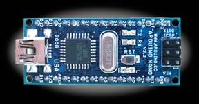 Arduino Nano is a surface mount breadboard embedded version with integrated USB. It is small, complete, and breadboard friendly. It has everything that Diecimila has (electrically) with more analog input pins and onboard +5V AREF jumper. Physically, it is missing power jack and power select jumper. Since the Nano automatically senses and switches to the higher potential source of power, there is no need for the power select jumper. 3.0 Version with Atmega328 |