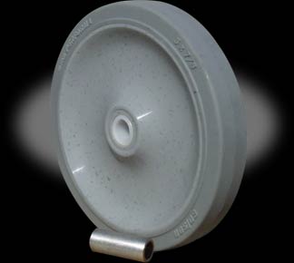 Colson Performa Wheels have long been a favorite of combat robot builders. The wheels in this series have been used on all sizes of robots, from 1lb Antweights to 340lb SuperHeavyweights! They are very durable, and provide excellent traction. Performa wheels offer the advantages of both hard and soft tread materials in a single wheel. Like a hard tread wheel, Performa rolls easily and is very durable. Like a soft tread wheel, it rolls quietly, protects floors and resists impacts with a cushion ride. It also features maximum weatherability, low temperature flexibility, resistance to chemicals, water and steam, and rejects floor debris such as metal shavings. Non-marking thermoplastic elastomer tread is permanently bonded to durable polyolefin wheel core. The rubber is 65 ±5 Durometer Shore A scale. No keyway is provided in these wheels, depending on your application, you may need to add a keyway yourself. This wheel comes with one separate metal bushing that can be added to make the wheel spin as a freewheel (Note this is NOT a one-way bearing, but simply a bushing to help the wheel spin freely on a stationary shaft.)