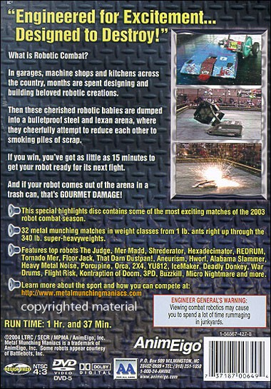 This special highlights disc contains some of the most exciting matches of the 2003 robot combat season. 32 metal munching matches in weight classes from 1 lb. ants right up through the 340 lb. super-heavyweights. Features top robots The Judge, Mer Madd, Shederator, Nexadecimator, REDRUM, Tornado Mer, Floor Jack, That Darn Dustpan!, Aneurism, Hworf, Alabamba Slammer, Heavy Metal Noise, Porcupine, Orca, 2X4, YU812, IceMaker, Deadly Donkey, War Drums, Flight Ricks, Kontraption of Doom, 3PD Buzzkill, Micro Nightmare and more! |