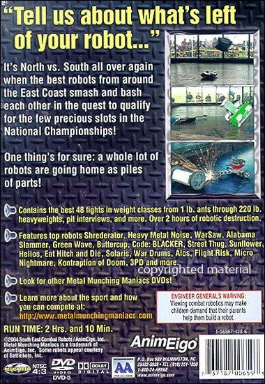 It's North vs. South all over again when the best robots from around the East Coast smash and bash each other in the quest to qualify for the few precious slots in the 2003 National Championships! You won't want to miss all the metal munching mayhem! One thing's for sure: a whole lot of robots are going home as piles of parts! |