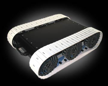 This platform is the most capable of The Machine Lab product line thus far. The MMP-40 mobile platform is the result of a conglomeration of input and ideas from people that are using robots in real life situations. We have gleaned detailed information from groups ranging from NASA sponsored research teams to Law Enforcement and SWAT agencies. We have even built several robots for the U.S. military that are in theater in Iraq right now. Following The Machine Lab philosophy, this is a bare bones simple but rugged machine intended to help bring ideas to fruition faster. The trend in mobile robotics is to get the machines as light and compact as possible without limiting their mobility in urban environments. At 40 pounds this platform is is designed to be a "Man Portable" workhorse. The machine can easily carry 30 pounds of payload and has plenty of space to be outfitted with cameras, sensors, computers, tools, test equipment, supplies, etc. The best feature of this platform is that it can climb stairs. The added length and stair climbing ability allows the MMP-40 to negotiate larger obstacles and to reach deeper into urban environments. The MMP-40 is has a water resistant aluminum hard anodized chassis. All drive train components are precision machined and all metal with long life ball bearings in critical areas. Platforms come assembled/wired and ready to run. There is a main power switch and charge jack. All that is needed is a control signal and a battery charger. Please inquire if you have custom applications for these robots that may require consulting or prototyping.