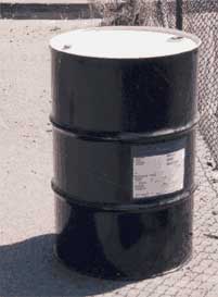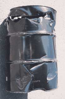| Here's a 50 gallon steel drum I picked up for Nightmare to play with! | Same Drum, about 10 minutes later. One hit, Nightmare actually threw it about 10 feet into the air! Cool! | ||