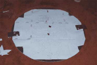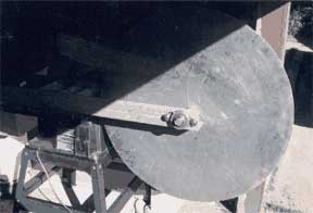 | I decided to cut some holes in the disc to lighten it up and provide a cool pattern, while making it heavier on the outside than on the inner portion. This makes is spin faster and adds additional force to the teeth at the very edges. Here, I've laid out a pattern by tiling a computer printout and taping it to the disc. From there, I simply took the power drill and hole saw (yes, handheld, it was too big to fit on my drill press!) and drilled where the paper marked it. Hey, low tech, but it worked just fine! |