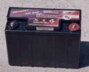 | The PC545 Hawker Odyssey Drycell battery I am using to power Nightmare's weapon and a second one for his drive motors. Yes, the first version of Nightmare was only running on 12 volts, both for weapon and for drive. |