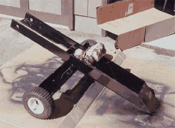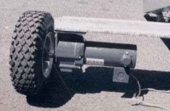 and can push around most robots in the arena. Here is the gearmotor for the drive wheel mounted in its final location on the robot. The 11.5 inch diameter tires have a custom-made hub attachment to the shaft of the motor with a taper bushing. Now I just have to add some rear supports and route the wires up and through the frame. I am still overwhelmed at the power of these motors- which, by the way were donated by my sponsors- Grainger! Thanks guys! |