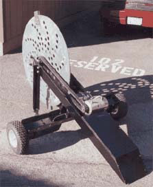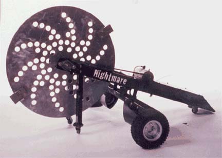 | Nightmare is a pretty simple design, really. If you look at the photos, you will notice the big disc in front. This is the primary weapon, with large stainless steel teeth bolted securely at opposite sides. The disc is NOT a saw blade. People often mistake it for one, it is a 'rotary bludgeoning device' where the two teeth act as sledgehammers. This disc, when spinning at the top speed of 300mph can be extremely destructive to any robot in its path. The little feet with casters you see in the front don't actually ride on the ground, but when the disc makes contact with its target, these feet keep the disc from hitting the ground and improve overall stability by leveraging the other robot into the air. |
