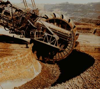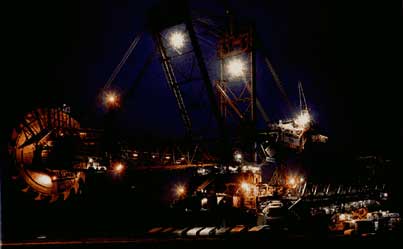 I wanted to get a couple of these stickers, but never got around to locating some/making some. Kind of fit the "dangerous robot" idea nicely... This is what is known as a Bucket Wheel Excavator. Amazing machine is over 700 feet long, it is used to dig up massive amounts of earth in large mining areas. This is the BIGGEST baddest machine I have ever seen! From what I hear, there are 6 of these babies on our planet! Here's the Bucket Wheel Excavator at night. Notice that small white speck on the lower left. That happens to be an automobile! I can't get enough of this thing. Here it is again digging a massive trench. See the guy standing on the edge of the trench? Did I mention how BIG this sucker is???
