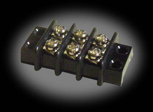 Double row barrier strip made from heavy-duty thermoplastic. 20 amp current rating. Screws are a #6 fine thread. ~0.325" spacing between vanes (dividers). 4 mounting holes: ~5/32" dia.