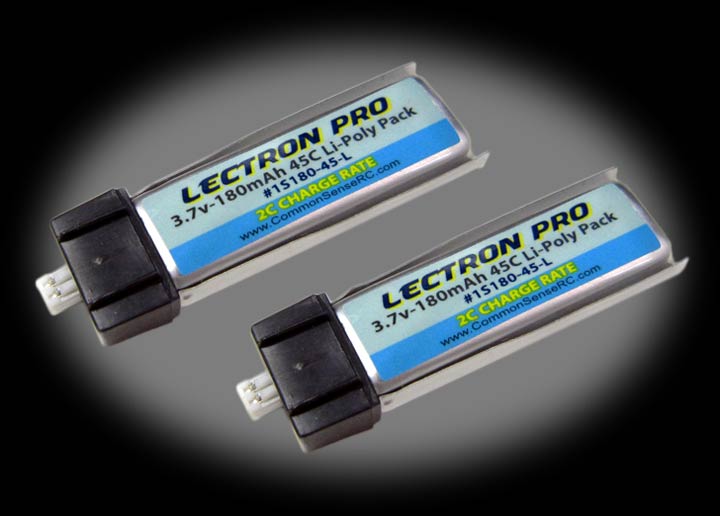 This 2-pack of single-cell Lithium Polymer 180mAh battery packs give you lots of extra runtime for your Blade mCX, mCX2, mSR, mSR X, Nano QX, Nano CPX, and UMX AS3Xtra. These batteries are also ideal for the ParkZone Vapor, Micro Citabria, Cessna 210, Ember, and the Parkzone Sukhoi among other micro planes. These batteries are plug-and-play compatible with both the helicopter and the stock charger. 45C continuous discharge rate.