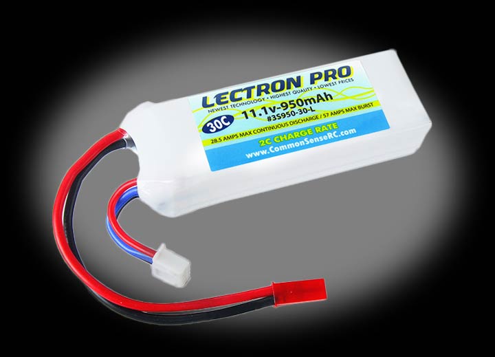 This 3-cell 950mAh lithium polymer battery pack fits right into the Blade 200 SR X with no modifications necessary, and will give you lots of extra runtime! 30C continuous discharge rate of 28.5 amps with 57 amp bursts.