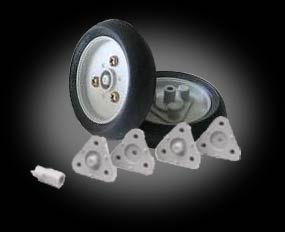 rubber tires on grey plastic wheels. Provides maxiumum diameter while