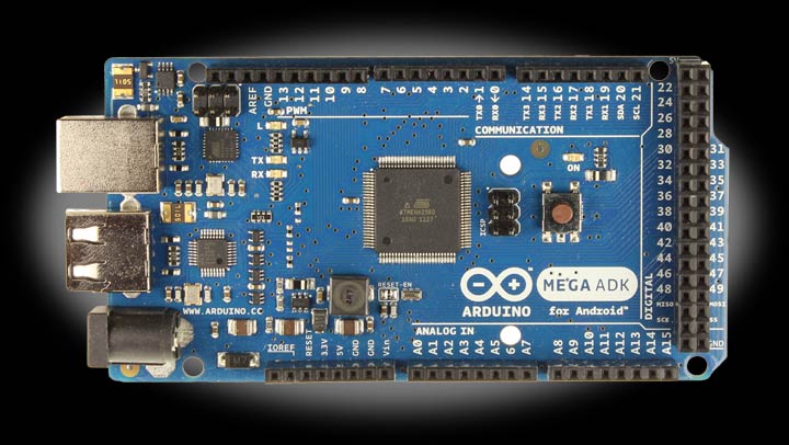 The Arduino MEGA ADK is a microcontroller board based on the ATmega2560. It has a USB host interface to connect with Android based phones, based on the MAX3421e IC. It has 54 digital input/output pins (of which 15 can be used as PWM outputs), 16 analog inputs, 4 UARTs (hardware serial ports), a 16 MHz crystal oscillator, a USB connection, a power jack, an ICSP header, and a reset button.