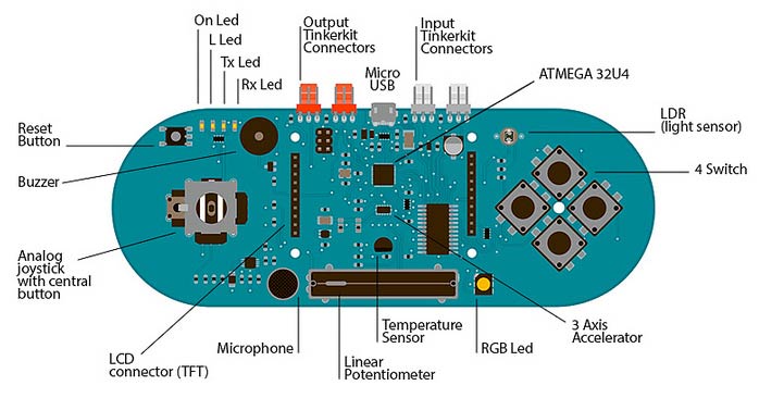 The design of the Esplora board recalls traditional gamepad design with an analog joystick on the left and four pushbuttons on the right. The Esplora has the following on-board inputs and outputs: