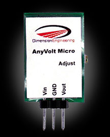 AnyVolt Micro is a miniature step-up / step-down switching DC-DC converter. The output is adjustable from 2.6V to 14V and currents up to 0.5A can be drawn. AnyVolt Micro is useful when you need to step from a lower voltage to a higher voltage, or when your input voltage occasionally dips below the output voltage.