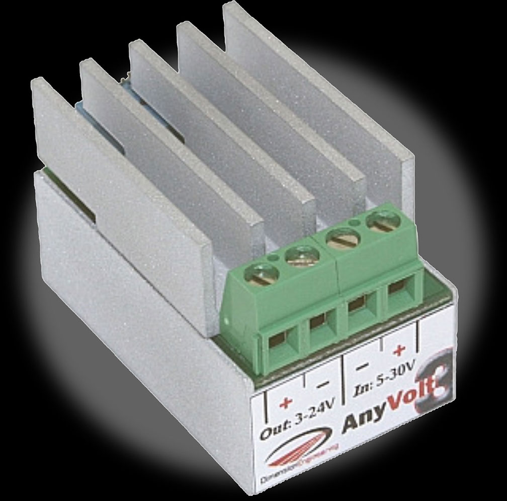 The AnyVolt 3 Universal DC-DC Converter is an adjustable step up / step down 3A switching regulator. The output is adjustable from 3 to 24V. The output voltage is set with a small screw potentiometer on the back of the AnyVolt 3. Once the output voltage is set, it does not matter whether input voltage is higher, lower, or the same as the desired output. The potential applications are endless and only limited by the unit's specifications and your collection of gadgets that require DC power at a different voltage than their supply.