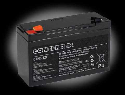 Contender AGM batteries utilize hybrid technology to provide high rate discharge capability and deep cycle power. Contender batteries are quality tested to provide peak performance in UPS, mobility and security applications. 6 volt 12Ah capacity at a 20hr rate with quick disconnect .187 faston terminals.