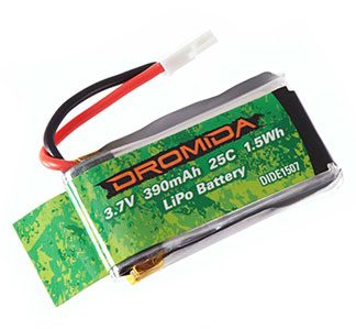 0-DIDE1507 Dromida LiPo Battery 1S 3.7V 390mAh Kodo Quadcopter <font color="00ff66" size="2" face="Arial, Helvetica, sans-serif">This is the 1S 3.7V 390mAH LiPo Battery for the Dromida Kodo Quadcopter.<p><b>FEATURES</b><br>Replaces worn Kodo quadcopter batteries<br>Recharges with the Kodo USB charger, DIDE1511<p>INCLUDES<br>1S 3.7V 390mAH LiPo Battery<br></p></font>
