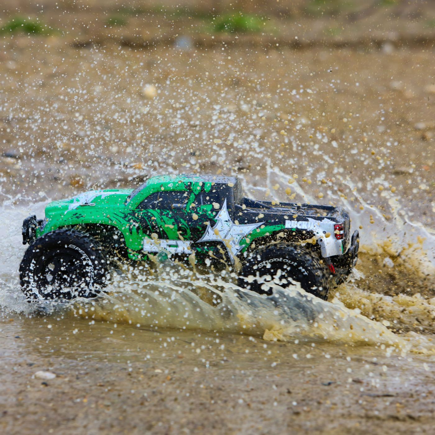 When you're in control of the Ruckus® Monster Truck you're ready to rumble with the largest basher in the ECX® lineup. The Ruckus will tear through any neighborhood or backyard with ease and because of its bulletproof chassis and extremely durable powertrain, maintenance is a breeze. The included Spektrum™ 2.4Ghz transmitter and SR201 receiver provides extended range and interference free operation while the potent 15T Dynamite® motor gets the truck up to speed quickly. Thanks to the waterproof Spektrum SR201 receiver and electronics, the Ruckus can handle anything Mother Nature or the terrain throws its way with ease. The Ruckus® Monster Truck is a true ready-to-run vehicle that comes with absolutely everything included in one box—right down to the AA batteries.FEATURES
