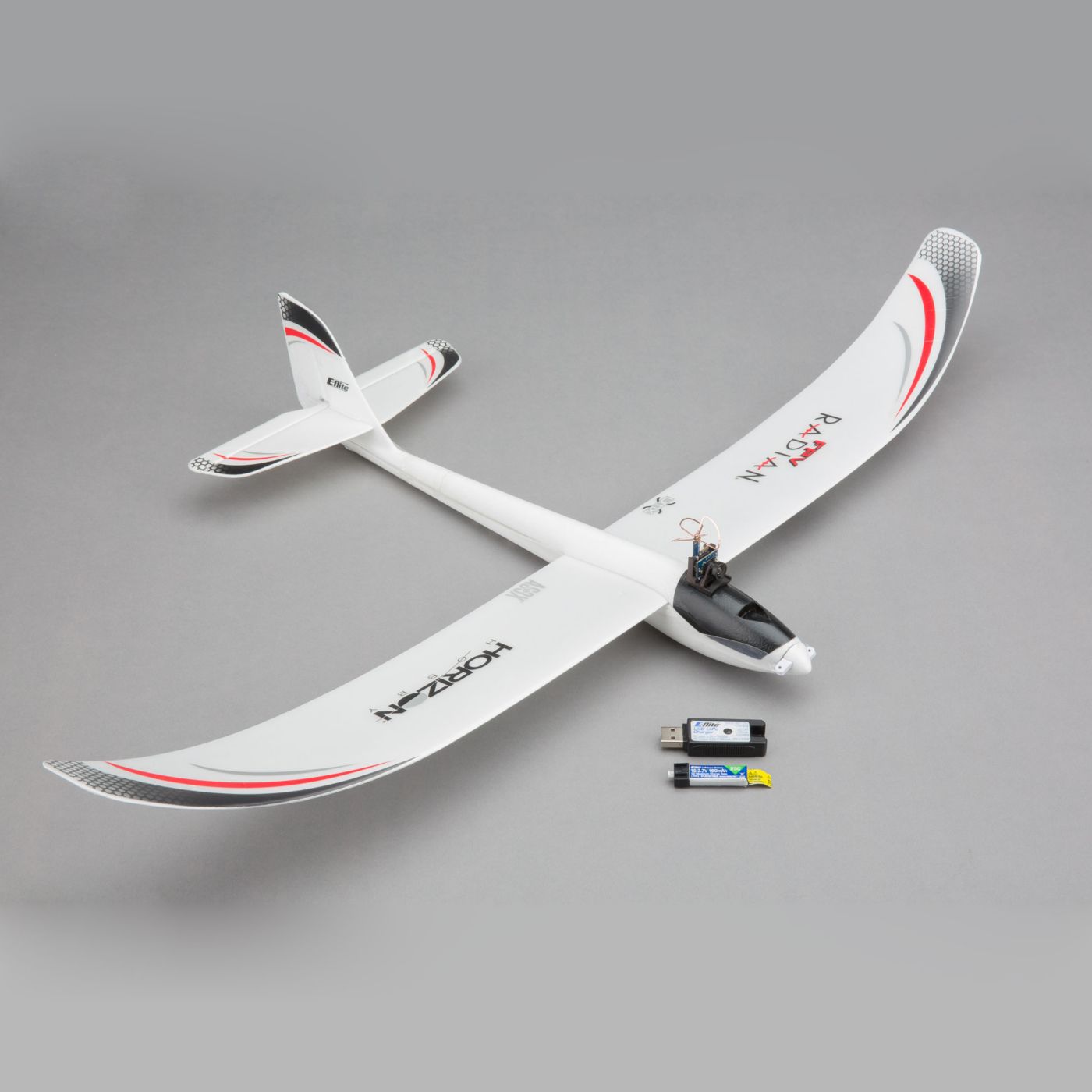 The included E-flite® 150mAh 3.7V 1S 25C Li-Po flight battery can be charged with the included charger that works from any USB power source.