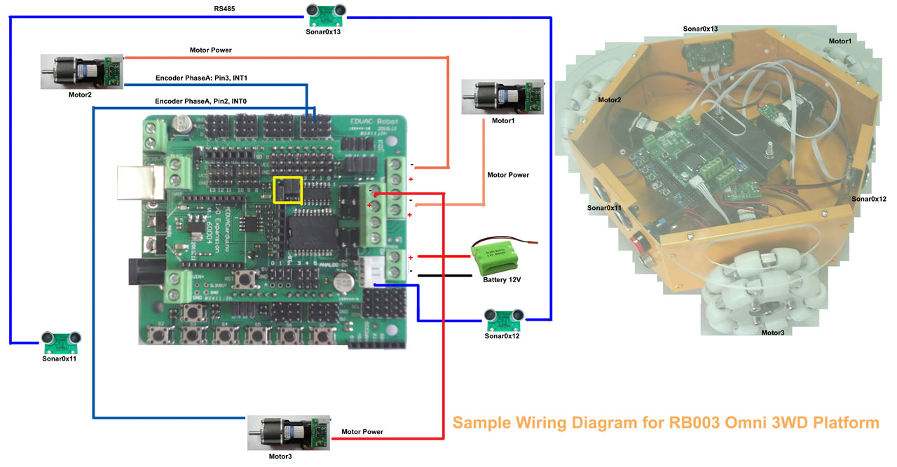 The FB003 Omni-Wheel robotic platform comes with 3 Omni-directional wheels driven by 3 DC motors, allowing rotation and movement in any direction simultaneously. Three infrared rangefinders allow the FB003 to track and chase objects, follow walls, and avoid obstacles.