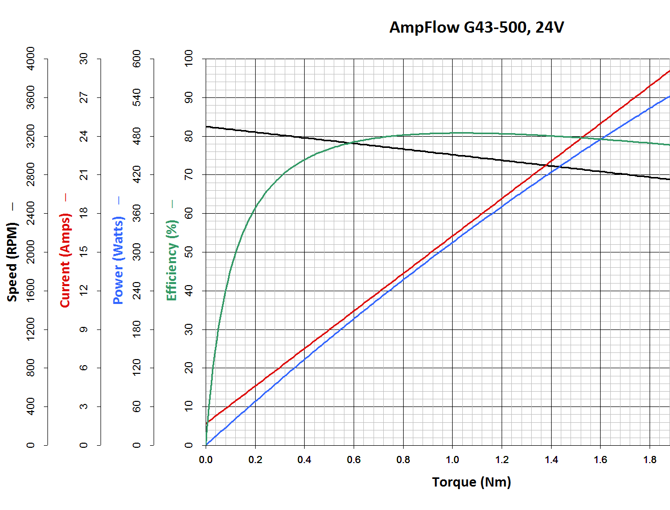 The above specifications are for 24V. The motors can also be used at 12V or 18V. The RPM is proportional to the voltage so running at 12V will result in half the no-load RPM that is shown above for 24V. The lower voltage also reduces the maximum achievable torque by 50%. The motors have also been tested and used at higher voltages resulting in higher RPM, torque, and power. Shorter duty-cycles are recommended for higher voltages to allow the motors time to cool.