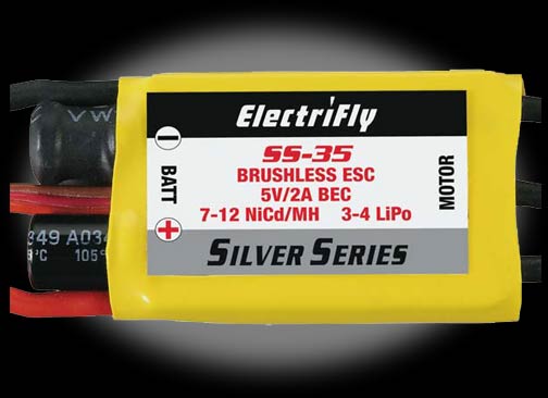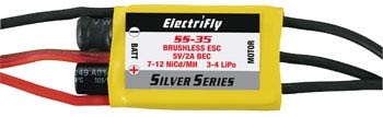 This is the ElectriFly Silver Series 35 amp Brushless Electronic Speed Control. Great for medium to larger high performance airplanes. Delivering 35A of continuous current with a built-in Battery Eliminator Circuit which can handle 2A, this ESC is very simple to use and very affordable.