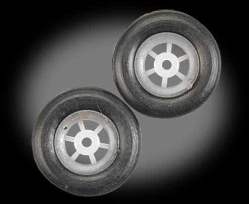 GWS Scale Rubber Wheel 15mm Diameter 2pk Rubber construction mounted on a white plastic, 6 spoke wheel.