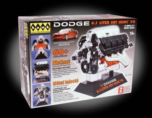 Lindberg 1/6 scale Dodge SRT-8 diecast engine kit is a replica of the 1/6 scale Dodge SRT-8 Engine model kit with diecast parts. This detailed replica has prepainted and diecast parts with a stand included.