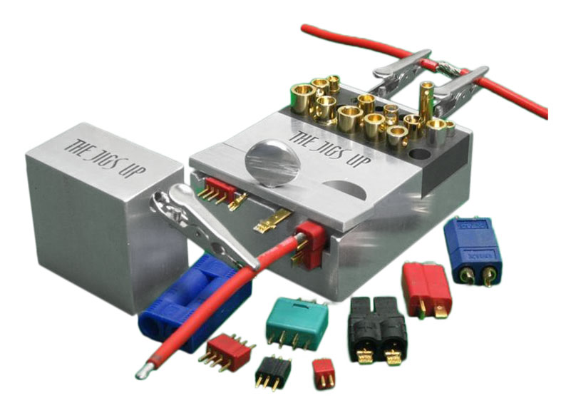 The Jigs Up holds the following connectors: XT60, Deans T connector, Traxxas, EC-3, EC-5, Deans Micro 2pin, 3pin, & 4pin connectors and 2mm, 3.5mm, 4mm, 5mm, 5.5mm, 6mm, 6.5mm and 8.0mm bullet connectors.