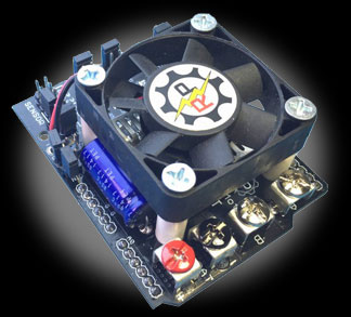The Robot Power MegaMoto GTª is a low-cost robust H-bridge "shield" for the Arduinoª and hardware compatible base units. The built-in cooling fan and heatsinks allow the MegaMoto GT to handle high current loads without overheating. Up to 50A (5 sec) of current may be controlled by the MegaMoto GT at 24V. This is over 1200W of power!