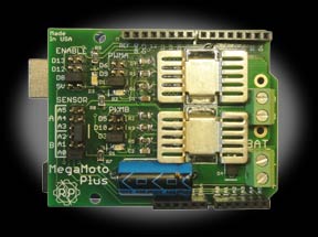 The Robot Power MegaMoto Plus is a low-cost robust H-bridge "shield" for the Arduino and hardware compatible base units. The standardized shield format stacking headers allows multiple MegaMoto Plus units to be controlled by a single Arduino Uno or Duemilanove using pass-through stacking headers.