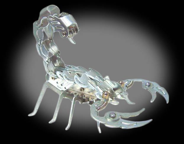 Almost lifelike, OWI's aluminum non-venomous invertebrate building kit features a Scorpion that you assemble from metal and bendable aluminum parts. The Samurai Scorpion is comprised of two major parts: head and body. The head consists of a pair of eyes, mouth, and claws used to capture prey. The body contains eight legs, tail and curved aculeus (stinger). Did you know that scorpions are nocturnal? They often feed at night by lying still and surprising their prey (dinner). On the other hand, they are dinner for tarantulas, bats, and birds (especially owls). Let's talk more specifics about Samurai Scorpion. The kit contains 30 hard and soft pre-punched aluminum parts, 7 screws, 7 nuts, 3 springs, and even assembly tools are included. Its claws, arms, legs, and tail are all moveable.