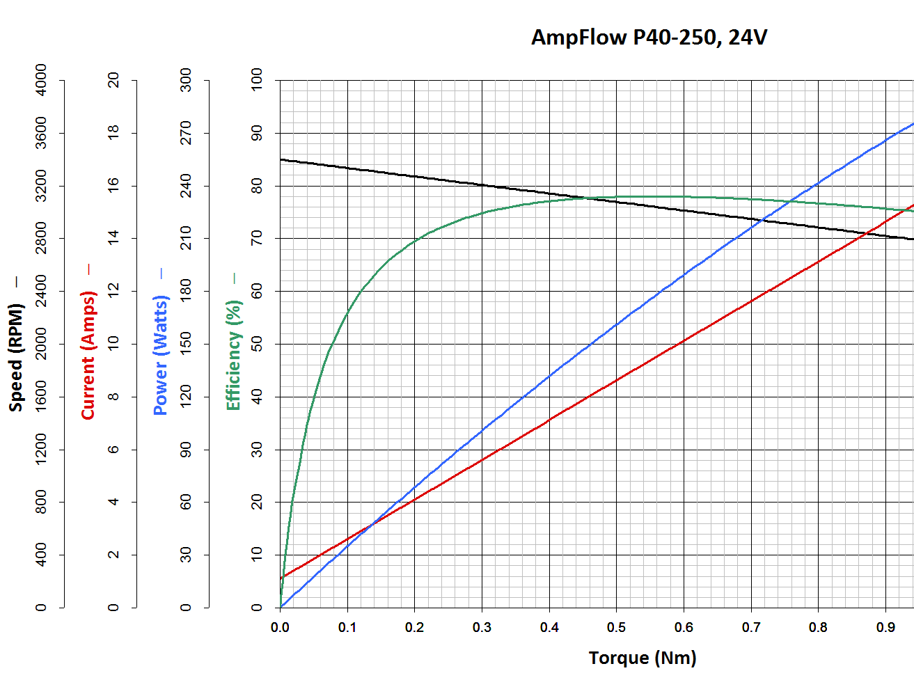 The above specifications are for 24V. The motors can also be used at 12V or 18V. The RPM is proportional to the voltage so running at 12V will result in half the no-load RPM that is shown above for 24V. The lower voltage also reduces the maximum achievable torque by 50%. The motors have also been tested and used at higher voltages resulting in higher RPM, torque, and power. Shorter duty-cycles are recommended for higher voltages to allow the motors time to cool.