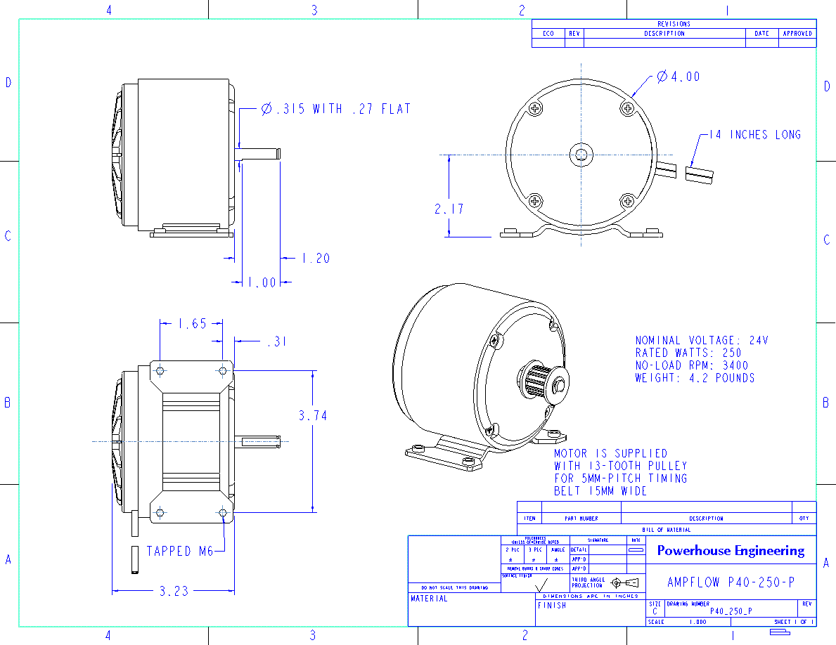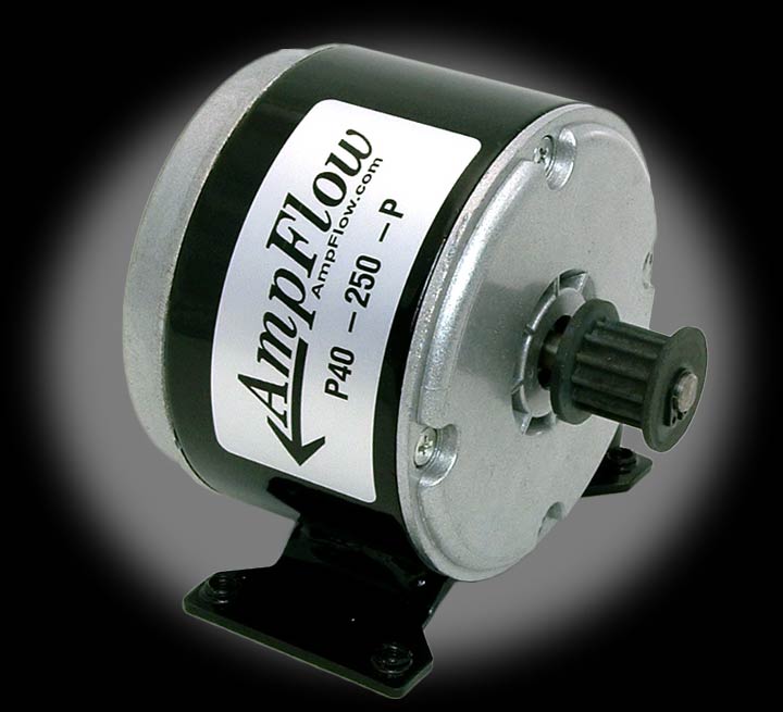 The smaller P40-250 motors have sustained outputs of 250 Watts (0.34 horsepower). These are available with either a sprocket or pulley.