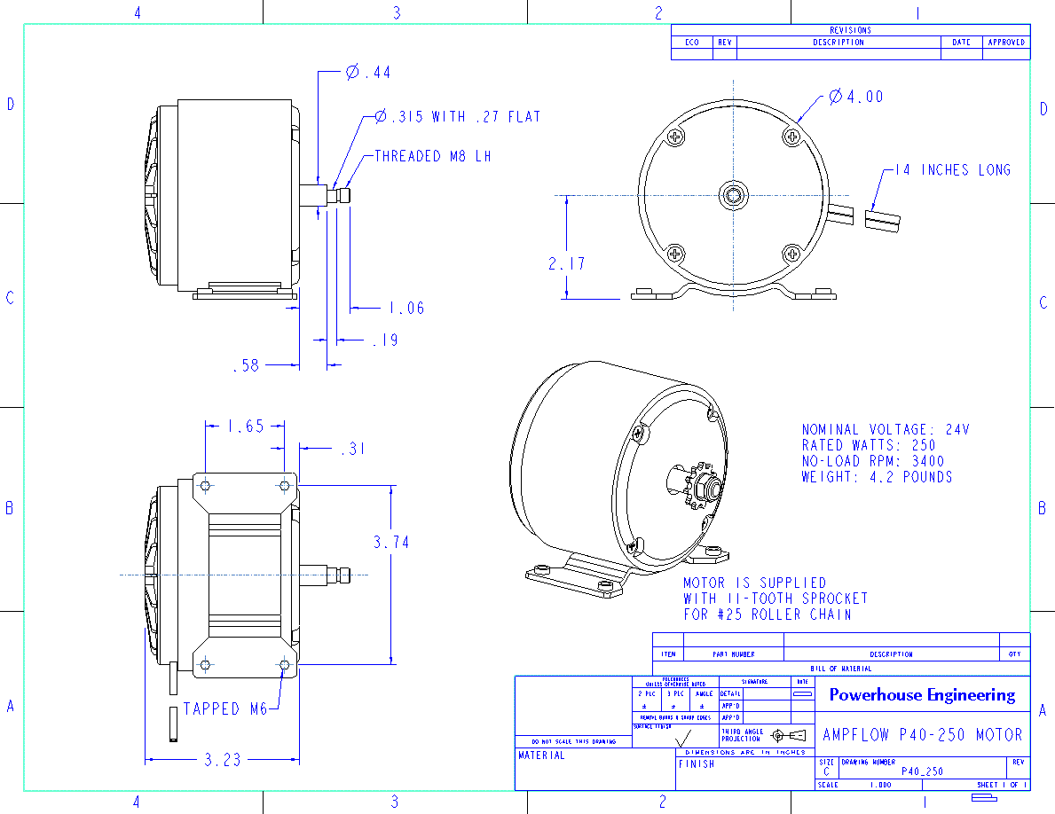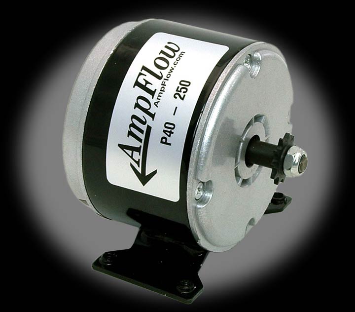 The smaller P40-250 motors have sustained outputs of 250 Watts (0.34 horsepower). These are available with either a sprocket or pulley.