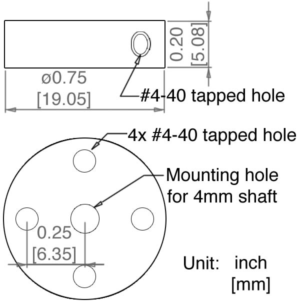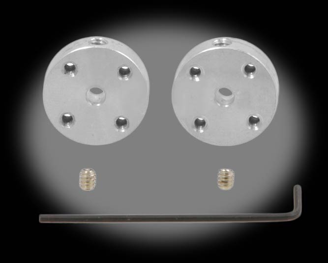 These universal mounting hubs are designed to work with most 4mm shafts, including round and "D" shafts. Each hub has four mounting holes for 4-40 screws (not included), letting you mount custom wheels or mechanisms to your motors. 4-40 hex set screws (one included for each hub) allow secure coupling of shaft to hub. A 0.05" hex wrench (often the smallest size in SAE Allen wrench sets) is included for use with the set screws.