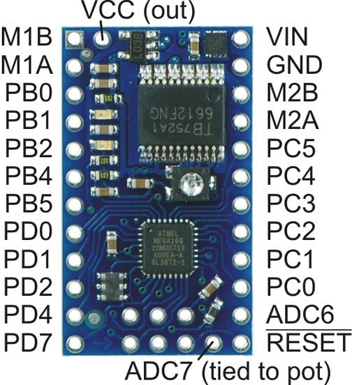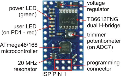 The compact module can be used as a DIP component on breadboards or prototyping boards, or the pin-less versions can be used for space-constrained installations in miniature robots. The 0.1" header pins are included with the Baby Orangutan B but are not soldered in. Power pins, one of the motor outputs, and several I/O lines are all accessible from one side to enable use of the Baby Orangutan as a single in-line pin (SIP) package for applications that do not require all of the I/O lines. The small size and low cost of the Baby Orangutan makes it a perfect option for primary control of small robots or for auxiliary control on larger robots.</font></p>